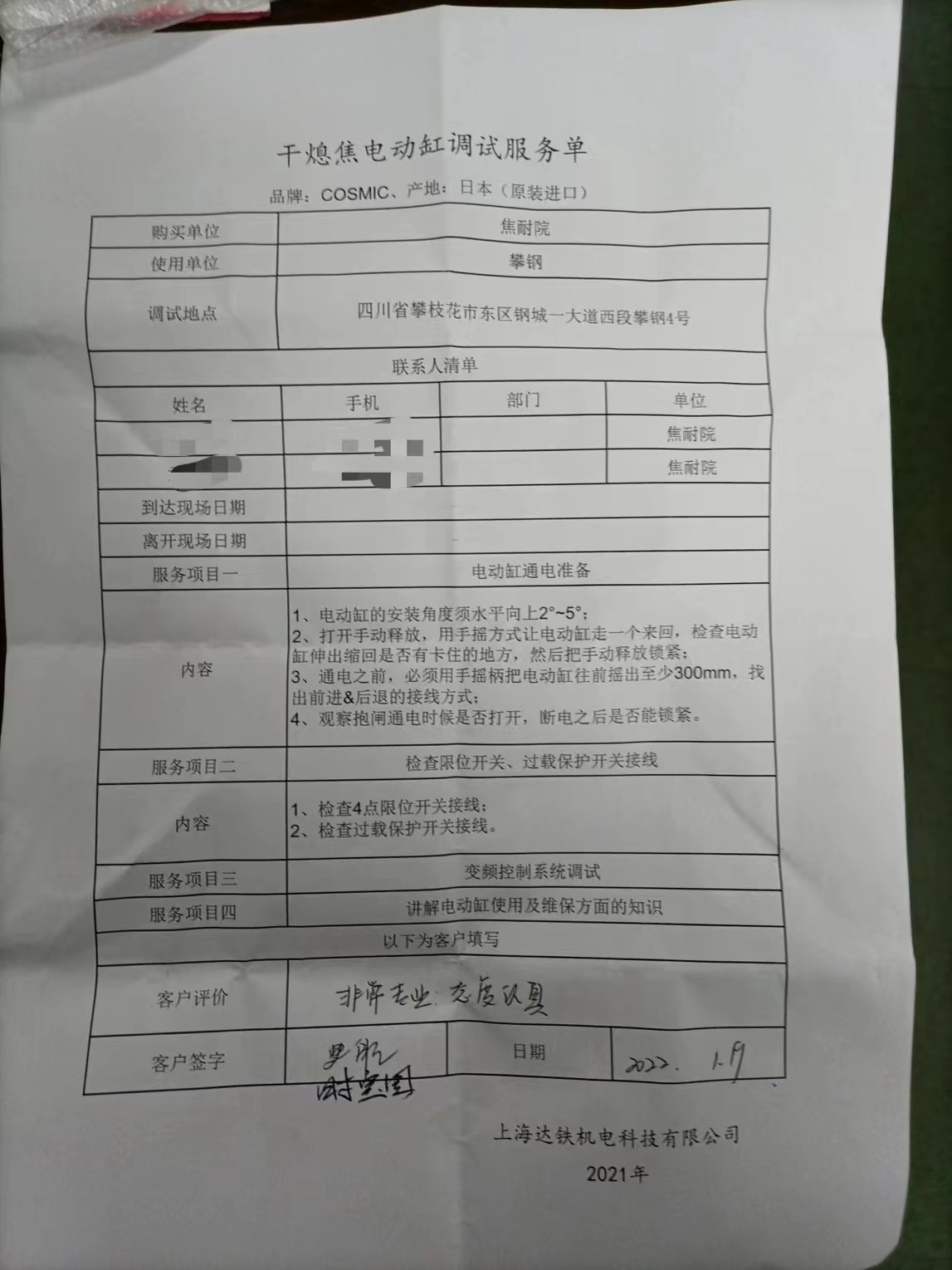 一直以来,上海达铁的COSMIC干熄焦电动缸在行业内的口碑一直不错,在经过考虑后,攀钢集团有限公司选择与在上海达铁合作,订购了几台干熄焦电动缸。2022年1月,上海达铁的工作人员前往攀钢集团进行安装调试工作,上海达铁的工作人员为攀钢的焦耐院同事进行了四项调试服务项目,最终金马焦化的的干熄焦电动缸安装调试项目成功完成。